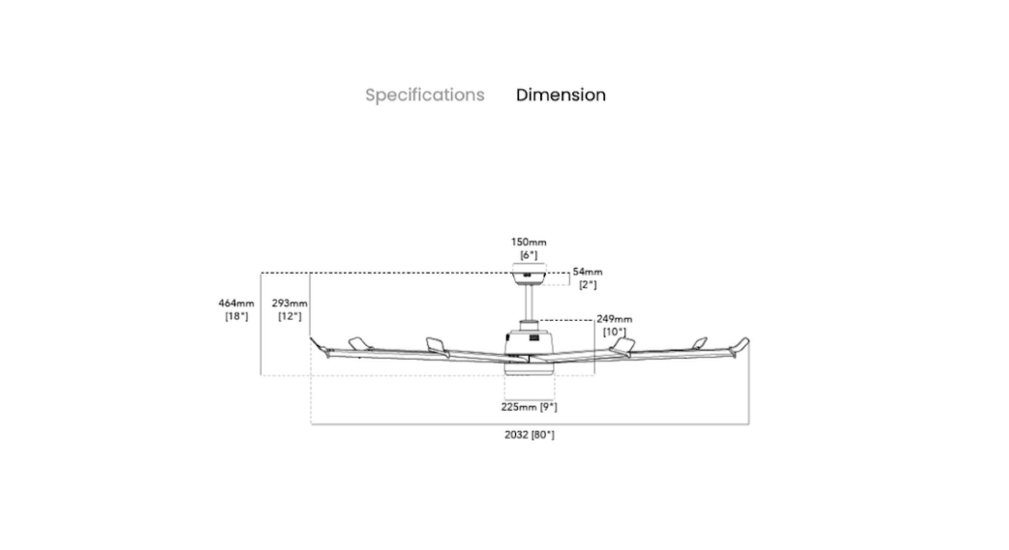 The AirWing Fan is a stylish and powerful addition to any room. With a sleek dark grey finish, this fan has a width of 80 inches and a height of 18/34 inches, making it a prominent feature in any space. The down rod measures 8/24 inches in length, adding to the overall stability of the fan.